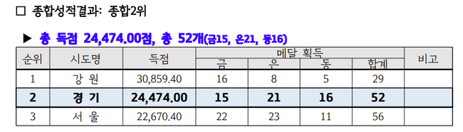 경기도는 지난 1월 27일부터 30일까지 강원특별자치도 일원에서 열린 이번 대회에서 총 24,474점을 기록, 금메달 15개·은메달 21개·동메달 16개 등 총 52개의 메달을 획득하며 강원특별자치도에 이어 종합 2위에 올랐다.
