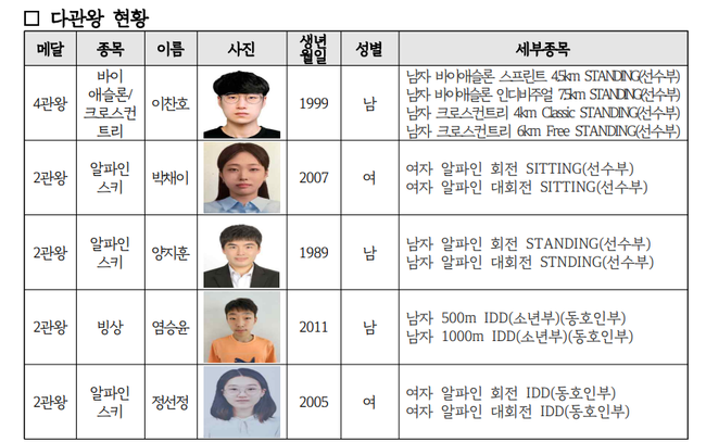 특히 이찬호 선수(1999년생)는 바이애슬론과 크로스컨트리를 넘나들며 4관왕에 오르는 압도적인 기량을 선보였다. 이 선수는 바이애슬론 스프린트와 인디비주얼, 크로스컨트리 클래식과 프리 종목에서 모두 금메달을 차지하며 대회 최고의 스타로 떠올랐다.