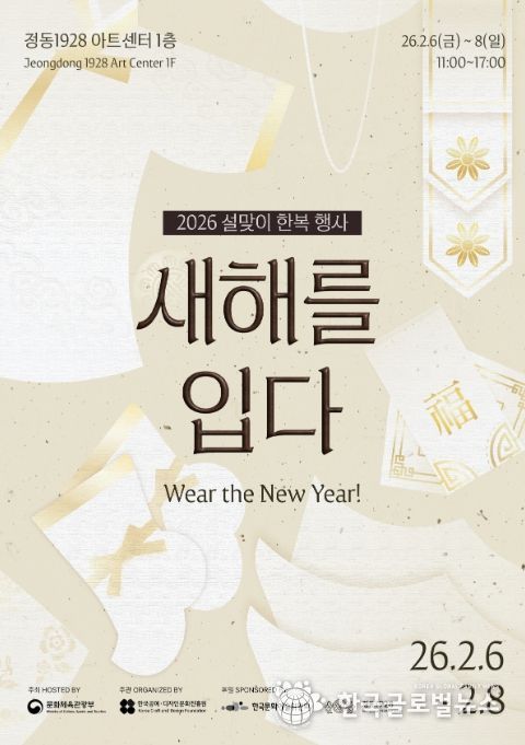 (한국글로벌뉴스 - 박소연 기자) 문화체육관광부는 한국공예·디자인문화진흥원과 함께 2026년 설을 맞이해 2월 6일부터 8일까지 정동1928 아트센터(서울 중구)에서 한복 문화 확산 캠페인 ‘새해를 입다’를 개최한다. 이번 캠페인은 민족 최대의 명절인 설을 맞이해 우리 고유의 의복인 한복의 가치를 되새기고, 일상에서 한복을 즐기는 문화를 널리 알리기 위해 기획한 행사다.