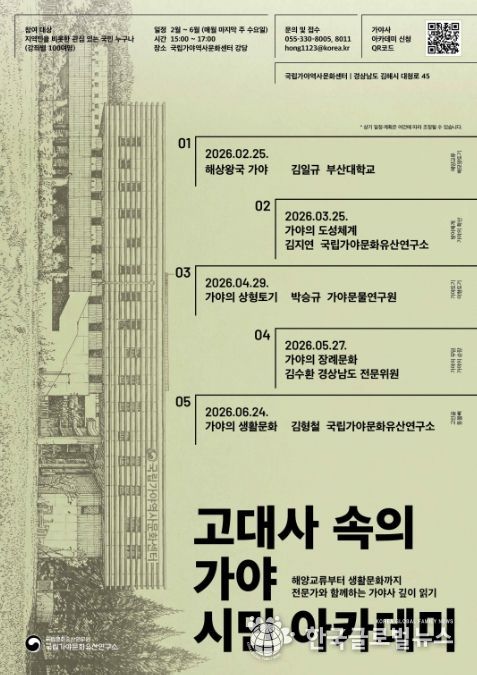 (한국글로벌뉴스 - 박소연 기자) 국가유산청 국립문화유산연구원 국립가야문화유산연구소는 2월부터 6월까지 매월 마지막 주 수요일, 국립가야역사문화센터 강당(경남 김해시)에서 시민들을 대상으로 '고대사 속의 가야' 시민 아카데미를 개최한다.