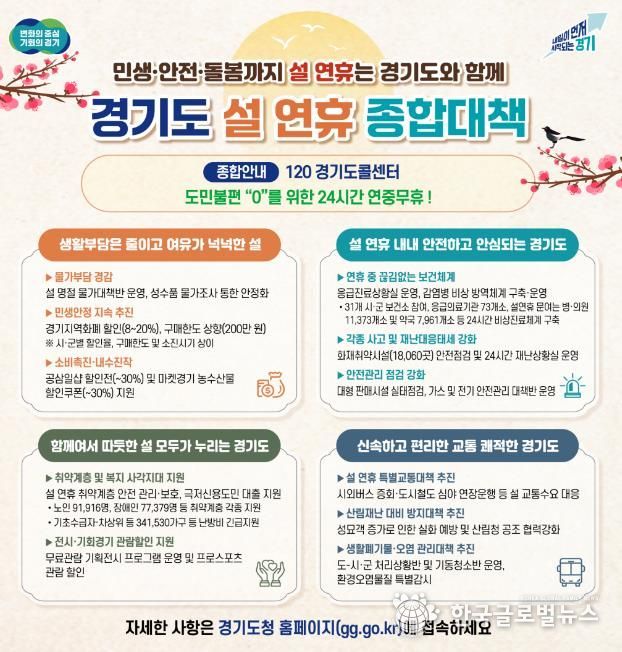 (한국글로벌뉴스 - 박소연 기자) 경기도가 도민들이 따뜻하고 편안한 명절을 보낼 수 있도록 ‘설 연휴 종합대책’을 추진한다.