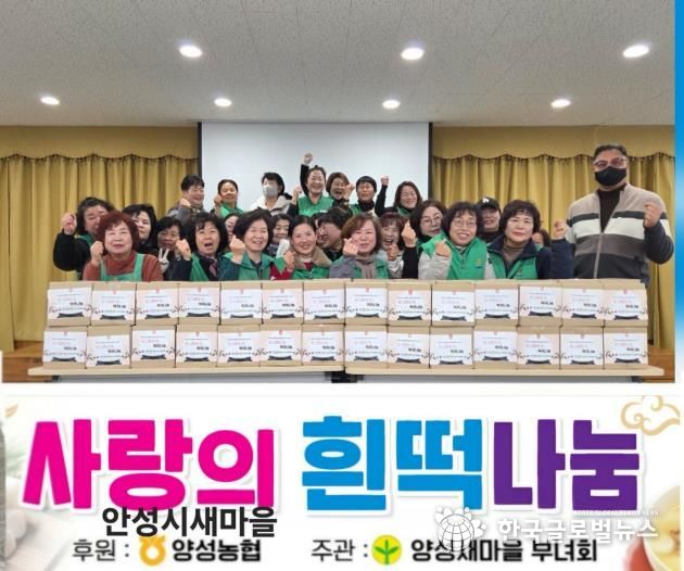 (한국글로벌뉴스 - 박소연 기자) 양성면 새마을부녀회는 민족 최대의 명절 설을 맞아 2월 10일 양성면행정복지센터에서 ‘사랑의 흰떡 나눔 행사’를 개최했다고 밝혔다.