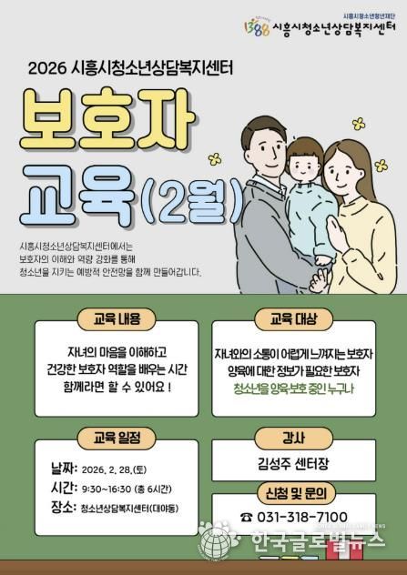 (한국글로벌뉴스 - 박소연 기자) 시흥시청소년청년재단 산하기관인 시흥시청소년상담복지센터가 보호자의 이해와 역할 강화를 통해 청소년을 지키는 예방적 안전망을 구축하고자 2026년부터 보호자 교육을 정기적으로 운영하고 있다.