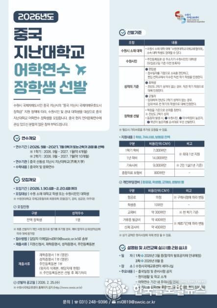 (한국글로벌뉴스 - 박소연 기자) 수원특례시는 2월 20일까지 ‘2026년도 지난대학교 어학연수 장학생 프로그램’ 참가자 1명을 모집한다.