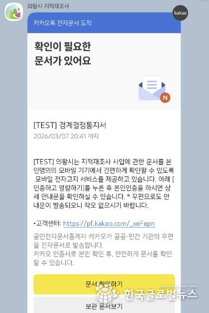 (한국글로벌뉴스 - 박소연 기자) 의왕시가 지적재조사 통지서를 스마트폰으로 발송하는 ‘모바일 전자고지 시스템’을 본격적으로 시행한다.