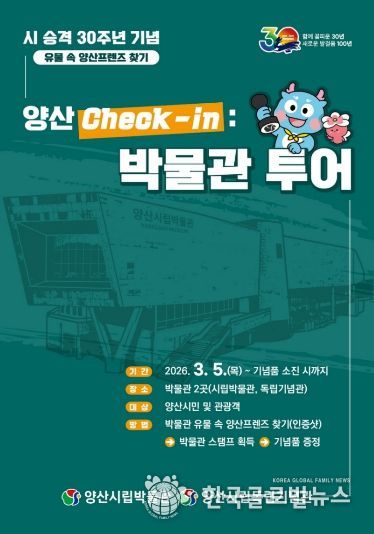 (한국글로벌뉴스 - 김정현 기자) 양산시립박물관(관장 신용철)은 시 승격 30주년 및 양산 방문의 해를 맞아 3월 5일부터 양산시민 및 관광객을 대상으로 박물관 투어 특별 이벤트를 운영한다고 밝혔다.