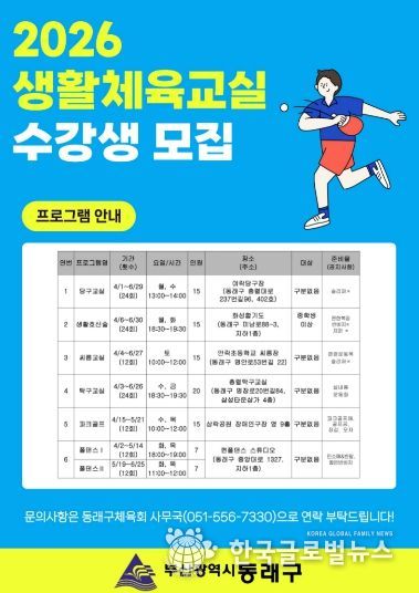 (한국글로벌뉴스 - 박지형 기자) 부산 동래구는 지역 주민의 생활체육 참여 확대와 건강한 여가 활동 지원을 위해 ‘2026년 상반기 생활체육교실’ 수강생을 모집한다고 밝혔다.