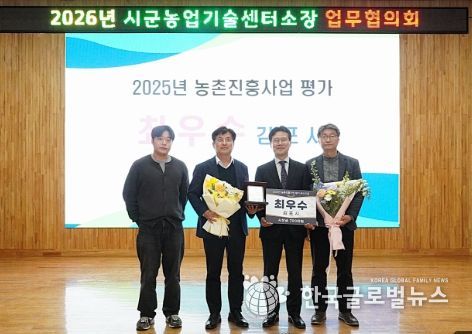 (한국글로벌뉴스 - 박종욱 기자) 김포시농업기술센터(소장 이재준)는 경기도농업기술원에서 개최한 2025년 농촌진흥사업 평가에서 우수기관 분야 ‘최우수상’, 지도정책 분야 ‘우수상’을 수상했다. 또한, 농촌진흥사업 평가에서 유공자 1명(도지사) 선정돼, 지난 3월 26일 경기도로부터 기관 표창 및 유공 공무원 표창을 받았다.