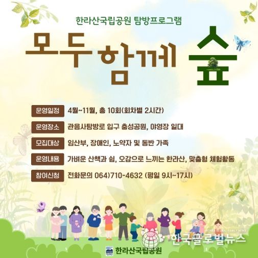 (한국글로벌뉴스 - 김정현 기자) 한라산국립공원이 4월부터 자연 체험과 치유를 결합한 탐방 프로그램 2종을 새롭게 선보인다. 제주특별자치도 세계유산본부는 ‘모두 함께 숲’과 ‘다같이 돌자, 야영장 한바퀴!’를 관음사 일대에서 운영한다.