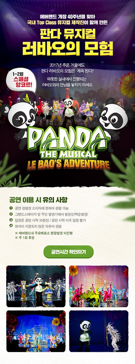 실내 공연장인 그랜드 스테이지에서는 판다 뮤지컬 '러바오의 모험'을 매일 2∼3회씩 공연한다.