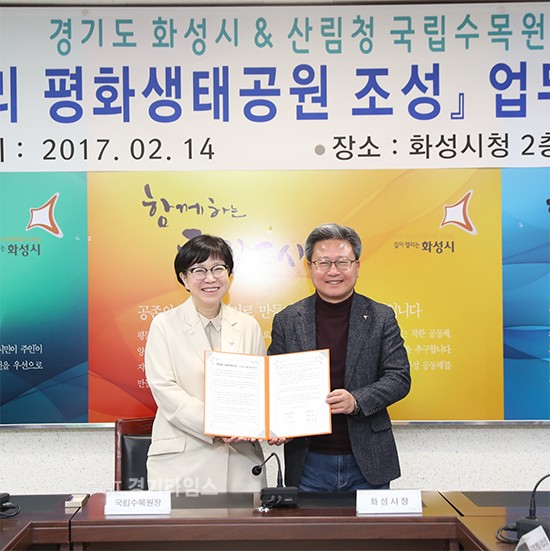 [경기타임스] 화성시가 여가.휴식. 치유공간 조성을 위해 국립수목원과 매향리 평화생태공원 조성 업무협약을 14일 체결했다.