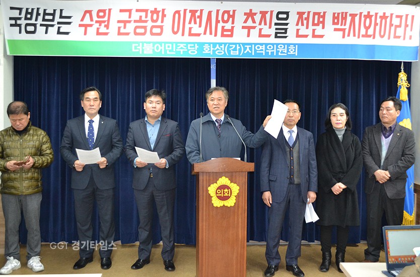 더불어민주당 김용(화성갑지역위원회위원)과 협의회장은 22일 경기도의회 브리핑룸에서 기자회견을 열어 국방부가 화성시 화홍지구에 수원 군공항 이전을 예비후보로 선정한것은 비민주성을 지적하며 백지화를 요구했다.