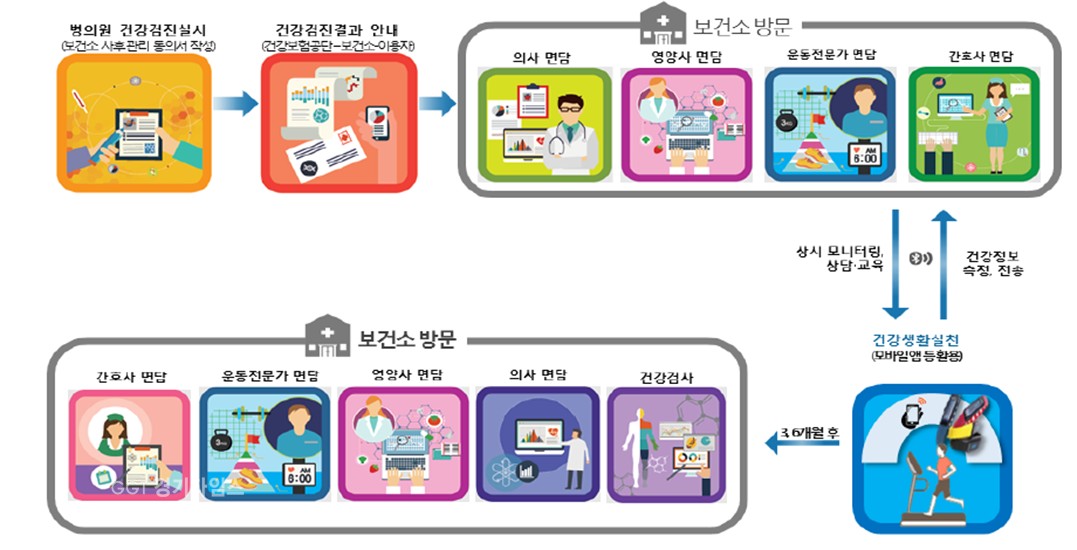이후 맞춤형 건강관리 계획에 따라 생활을 하면 모바일 앱을 통해 건강수치, 건강생활 실천 여부 등에 대한 정보가 자동으로 측정돼 보건소로 전송된다.