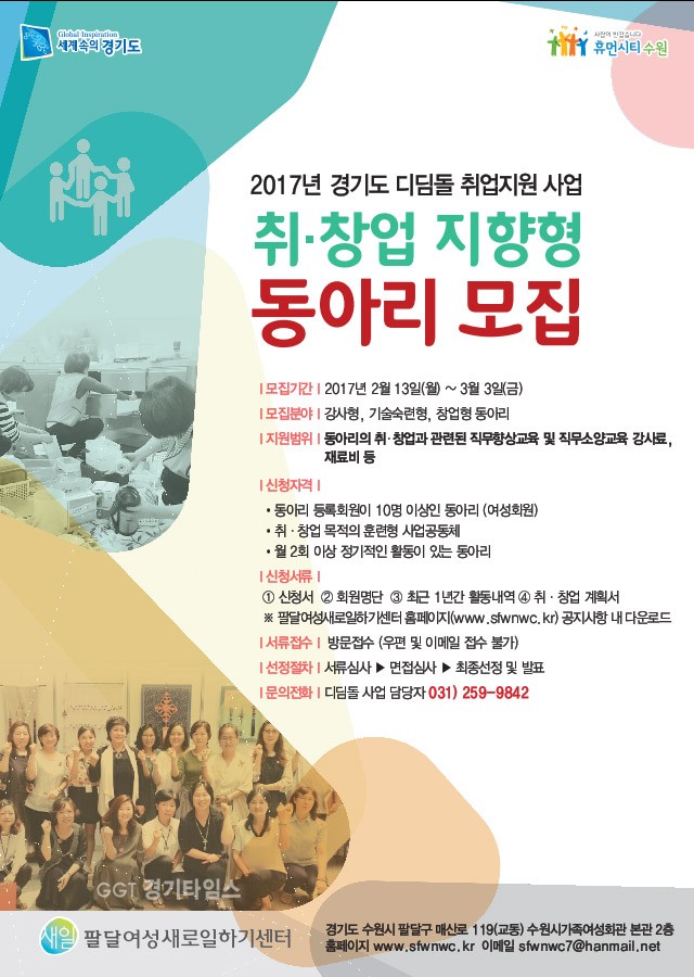 [경기타임스] 수원시 팔달여성새로일하기센터(아래 팔달새일센터, 센터장 황의숙)는 오는 3월 3일까지 올해 경기도 디딤돌 취업지원 사업 취·창업 지향형 동아리를 모집한다고 밝혔다.