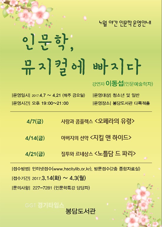 [경기타임스] 화성시 봉담도서관이 4월부터 야간 인문학 강좌 ‘인문학, 뮤지컬에 빠지다’ 를 운영한다고 6일 밝혔다.