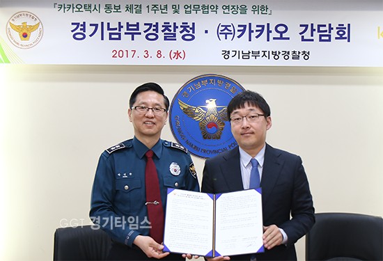[경기타임스] 경기남부지방경찰청 박건찬 차장과 ㈜카카오 정주환 모빌리티사업부문 총괄 부사장이 중요범죄 제보 및 요구조자 발견을 위한 카카오택시 동보체제(MOU)를 체결 했다고 8일 밝혔다.