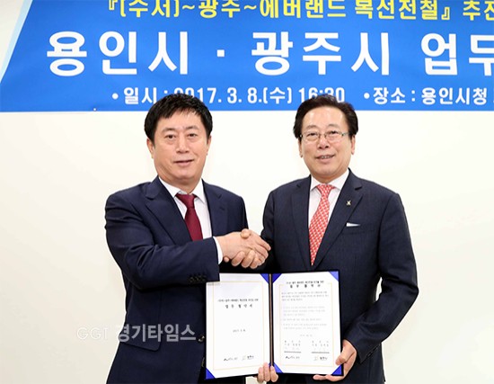 정찬민 용인시장은 8일 시청 파트너스룸에서 조억동 광주시장과 ‘수서~광주~에버랜드’를 연결하는 복선전철을 추진하기 위한 업무협약을 체결했다.