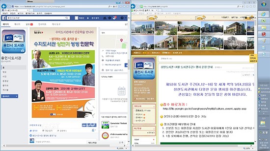 시는 이를 위해 페이스북(https://www.facebook.com/yonginlib)과 블로그(http://blog.naver.com/yonginlib)에 도서관 관련 각종 소식과 행사 등을 사진과 동영상 등을 곁들여 수시로 제공할 계획이다. 반면 사용자가 줄어든 트위터 계정은 폐쇄했다.