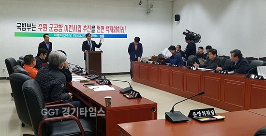 더불어민주당 화성갑지역위원회는 21일 화성시의회 대회의실에서 기자회견을 열고 연구용역분석이 나왔음에고 불구 국방부는 일방적으로 수원 군 공항 이전사업을 추진했다며 백지화를 촉구했다.
