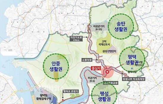 기지 확장공사가 90% 이상 끝나 1천467만7천㎡ 규모의 기지가 웅장한 모습을 드러내고 있으며, 우측에는 경기 남부지역 평야인 오성뜰이 펼쳐진다.