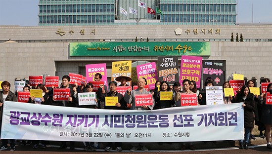 [경기타임스] 광교상수원보호구역해제 반대 범시민대책위원회(광교상수원대책위)광교상수원 지키기 시민청원운동 선포 기자회견을 22일 오전 수원시청 앞에서 열렸다.