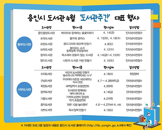 자세한 프로그램의 일정과 내용은 용인시 도서관 홈페이지(http://lib.yongin.go.kr)에서 확인 할 수 있다.