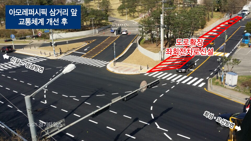 시는 아모레퍼시픽 연구소 옆 진출입 구간에 교통섬을 없애고 50m 길이의 좌회전 차선을 신설했다. 사업비는 1억8천여만원이 투입됐다.