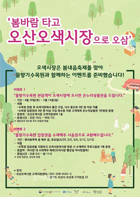 오산오색시장은 물향기수목원과 29-5월14일까지 2017 전통시장 봄내음 축제를 이벤트를 마련했다고 27일 밝혔다.