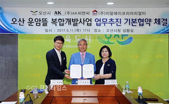 11일 시청 상황실에서 운암뜰 복합개발의 성공적 사업추진을 위해 ㈜AK C&C (대표이사 최완배), ㈜ERA코리아리얼티 (대표이사 강정임)와 기본협약을 체결했다.