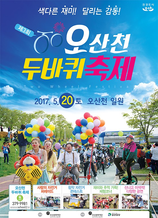 2017 ‘오산천 두바퀴축제’관련 참여와 궁금한 사항은 www.wheel2.kr (재)오산문화재단 문화사업팀(Tel 031-379-9981)으로 문의하면 된다.
