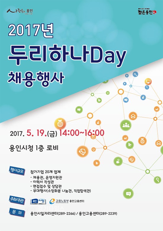 [경기타임스] 용인시는 ‘두리하나Day’ 채용박람회를 오는 19일 오후 2시 시청 로비에서 개최한다고 15일 밝혔다.