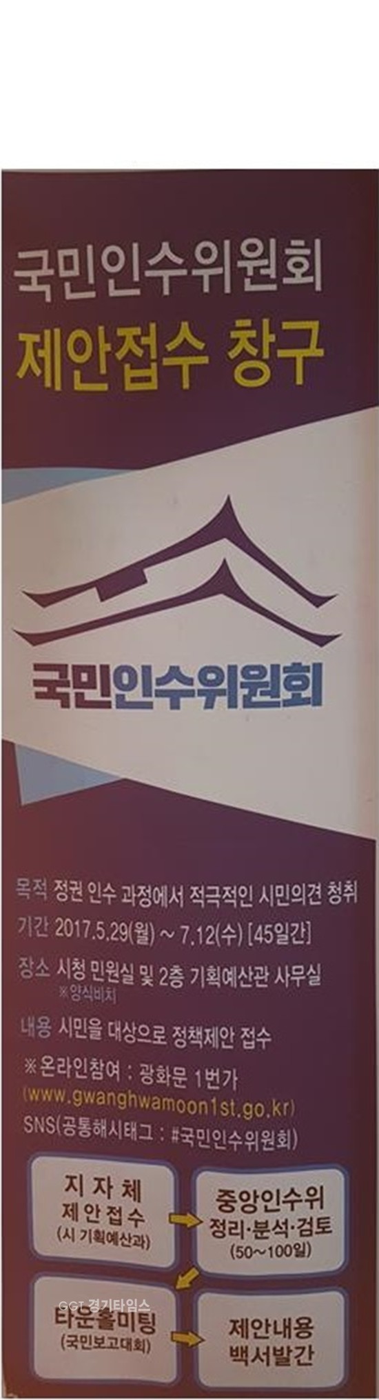 국민인수위원회 제안접수 창구는 시청 1층 민원실과 2층 기획예산관에서 운영중이며 시민들의 정책제안이나 인재추천 등의 의견을 받아 국민인수위원회에 전달하게 된다.