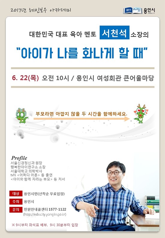 [경기타임스] 용인시는 레인보우아카데미 네 번째 특강으로 22일 여성회관 큰어울마당에서 육아전문가인 행복한아이연구소 서천석 소장이 강연을 한다고 19일 밝혔다.