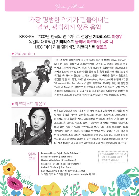 오산문화예술회관 소극장 시리즈 공연의 두 번째 프로그램인 ⌜기타와 리코더⌟는 남미와 유럽의 음악을 한국과 독일의 대표적인 기타리스트인 이성우와 올리버 파르타쉬 나이니 그리고 ‘리코더계의 아이돌’로 일컬어지는 리코디스트 염은초가 함께하는 아름답고 흥미로운 형식의 공연이다.