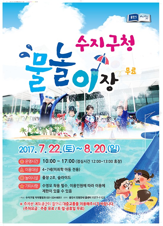 수지구는 시청까지 거리가 멀어 물놀이장을 이용하지 못해 아쉬워하는 주민들이 많다는 판단에 따라 올해 처음 구청 광장에 물놀이장을 조성해 오는 22일~다음달 20일까지 운영키로 했다고 17일 밝혔다.