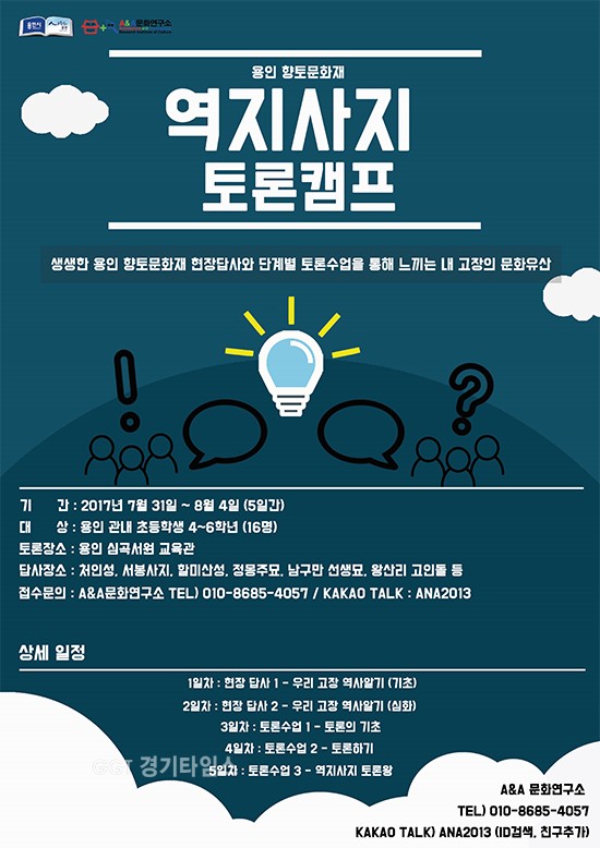 시 관계자는 “이번 토론 캠프는 초등학생들의 창의적 사고를 배양하고 용인 향토문화에 대한 새로운 시각을 열어주기 위해 마련했다”고 말했다.