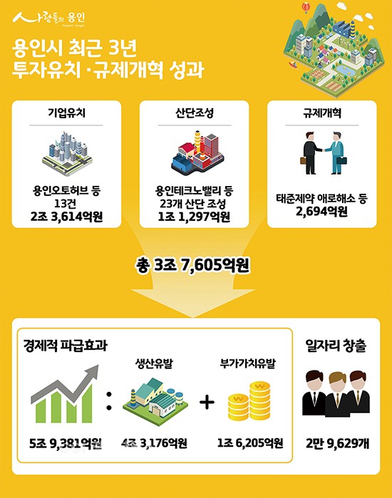 분석에 따르면 용인시가 이 기간 동안 투자를 유치한 금액은 용인오토허브자동차서비스복합단지 등 13건의 기업유치로 2조3천614억원, 용인테크노밸리 등 23개 산업단지 조성으로 1조1천297억원, 각종 규제개혁으로 2천694억원에 달했다.