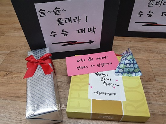 전달된 응원물품은 마북동 청소년지도위원들이 십시일반 모금해 마련한 수능 복주머니와 도서상품권, 보온병, 초코렛 등으로 ‘술술 풀려라! 수능대박!’, ‘너의 꿈을 응원해!’ 등의 메시지를 담았다.