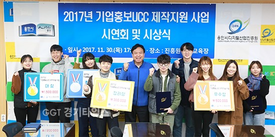 [경기타임스] 용인시디지털산업진흥원은 관내 중소기업의 마케팅을 지원하고 대학(원)생들의 콘텐츠 기획 및 제작 역량 강화를 위해 ‘2017년 기업홍보UCC 제작지원 사업’을 펼쳐 우수한 성적을 거둔 4개 팀을 선정해 지난 30일 시상식을 개최했다고 밝혔다.