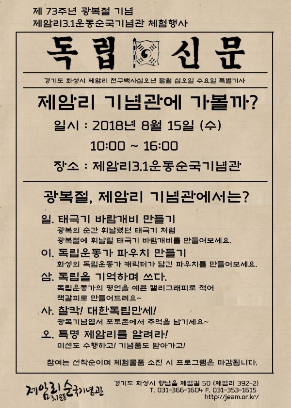 같은 날 제암리 3.1운동 순국기념관에서는 방문객을 대상으로 ▲태극기 바람개비 만들기 ▲독립운동가 파우치 만들기 ▲독립운동가 명언 캘리그래피 등 체험 프로그램이 운영된다.