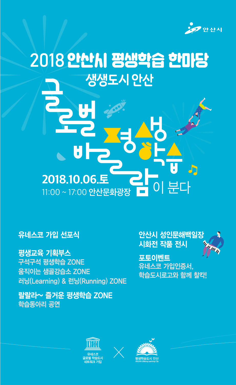 안산시(시장 윤화섭)는 ‘생생도시 안산! 글로벌 평생학습바람이 분다~’를 주제로 오는 10월 6일 안산문화광장 일원에서 시민 누구나 학습의 즐거움을 누릴 수 있도록 「2018 안산시 평생학습 한마당」 행사를 개최한다.