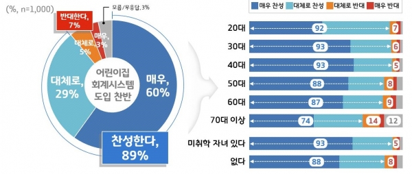 경기도는 지난달 ㈜케이스탯리서치에 의뢰해 도민 1,000명을 대상으로 ‘도정 여론조사’를 실시한 결과, ‘매우 찬성’(60%)과 ‘대체로 찬성’(29%)을 포함해 응답자의 89%가 어린이집 회계관리시스템 도입에 ‘찬성했다’고 밝혔다.