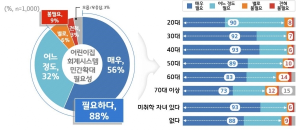 이어 민간어린이집 회계관리시스템 도입확대에 대해서도 ‘매우 필요하다’가 56%, ‘어느 정도 필요하다’ 32%로 응답자의 88%가 동의하고 있는 것으로 조사됐다.