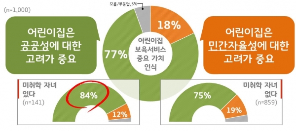 ‘어린이집 보육서비스’에 대해서는 ‘어린이집은 공공성에 대한 고려가 중요하다’는 응답이 77%를 차지한 반면, ‘어린이집은 민간자율성에 대한 고려가 중요하다’는 응답은 18%에 그쳤다.