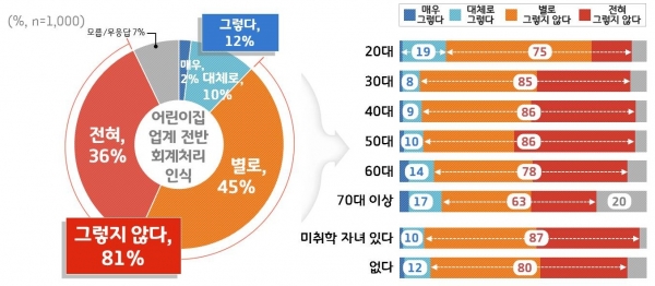 이와 함께 어린이집 업계전반의 회계처리에 대한 도민들의 인식을 조사한 결과, 재무?회계 처리가 ‘제대로 이뤄지고 있다’는 응답은 12%에 그친 반면 ‘그렇지 않다’는 응답은 81%에 달했다.
