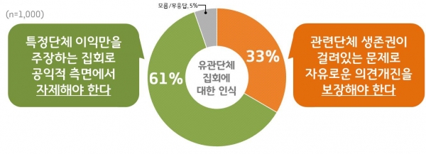 이어 회계관리시스템 도입에 반대하는 유관단체들의 집회에 대해서는 ‘특정단체 이익만을 주장하는 집회로 공익적 측면에서 자제해야 한다’는 응답이 61%로 나타난 반면, ‘관련단체 생존권이 걸려있는 문제로 자유로운 의견개진을 보장해야한다’는 응답은 33%인 것으로 확인됐다.