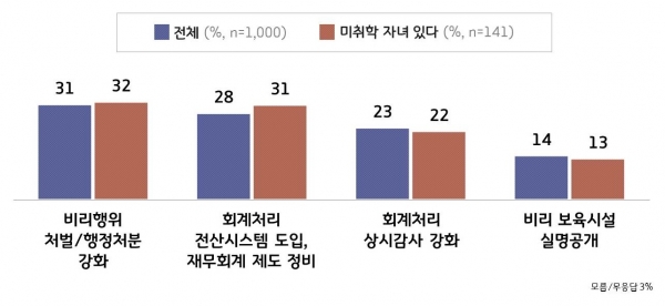 어린이집의 재무?회계 투명성 강화를 위해 필요한 조치로는 ▲비리행위 처벌 또는 행정처분 강화(31%) ▲회계처리 전산시스템 도입 및 재무?회계 제도 정비(28%) ▲회계처리 상시감사 강화(23%) ▲비리 보육시설 실명공개(14%) 등이 꼽혔다.