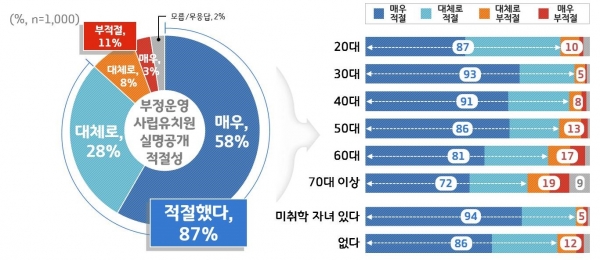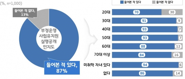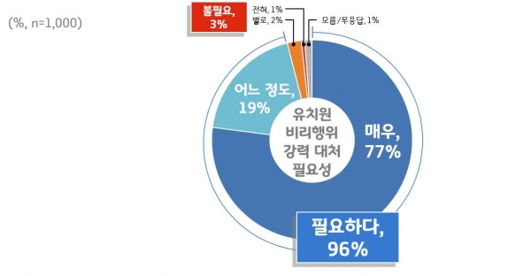 이밖에 부정운영 사립유치원 실명공개에 대한 적절성을 묻는 질문에는 87%가 ‘적절하다’고 답했고, 사립유치원 비리행위에 대한 처벌 수준에 대해서는 96%가 ‘형사고발, 행정처분 등 강력한 조치가 필요하다’고 응답했다.