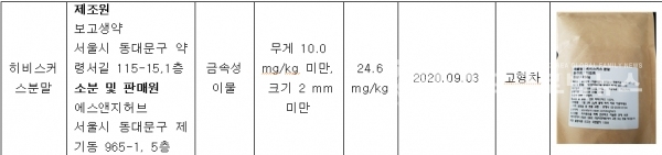 이어 흥일당이 제조한 ‘마테가루’와 보고생약이 제조한 ‘히비스커분말’에서는 각각 25.3 ㎎/㎏와 24.6 ㎎/㎏의 쇳가루가 검출, 기준치의 2배가 넘는 쇳가루를 포함한 것으로 조사됐다.