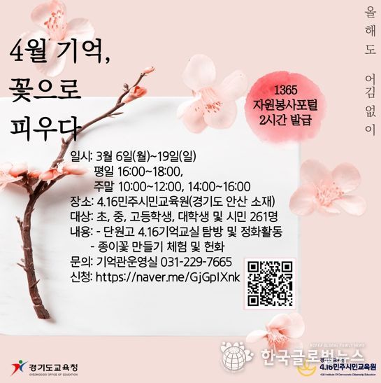 (한국글로벌뉴스 - 박소연 기자) 4.16민주시민교육원이 세월호 참사 9주기를 맞아 단원고 4.16기억교실의 의미를 되새기기 위해 ‘4월 기억, 꽃으로 피우다’프로그램 참가자를 모집한다.
